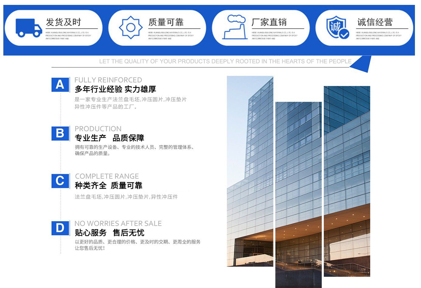 山東恒駿金屬制品有限公司是一家集生產(chǎn)法蘭盤毛坯,法蘭毛坯廠家,沖壓圓片,沖壓墊片,異性沖壓件生產(chǎn)廠家等產(chǎn)品,可根據(jù)客戶需要訂做各種法蘭盤毛坯。 多年來,以科學(xué)的生產(chǎn)工藝、嚴(yán)格的質(zhì)量管理、先進(jìn)的服務(wù)理念、合理的銷售價格,在國內(nèi)外廣大用戶中贏得了良好的聲譽(yù)。 我公司成立迄今,正是由于各界朋友們對于我們的持續(xù)支持與關(guān)懷,及本公司全體同仁辛勤的耕耘與付出,使公司持續(xù)發(fā)展與茁壯成長。展望未來,我公司人懷著感恩之心,更加追求卓越的業(yè)績,來回饋社會,服務(wù)顧客。 我公司誠摯的希望與新老客戶在互惠互利、友好合作的基礎(chǔ)上,建立良好的貿(mào)易關(guān)系,歡迎各單位來人來函到我企業(yè)指導(dǎo)工作,我們有著一支優(yōu)秀的員工團(tuán)隊,我們堅信企業(yè)的競爭、產(chǎn)品的競爭、技術(shù)的競爭,歸根到底是人才的競爭,只有具備了高素質(zhì)的員工才能形成高素質(zhì)的企業(yè),才能掌握市場競爭的主動權(quán)。 我公司理念:“誠實守信,雙贏有泰”,我們對待每位戶都遵循行業(yè)誠信,不虛報產(chǎn)品價格,客戶下訂單后我們抓緊生產(chǎn),保證工期,我們愿與新老客戶本著精誠合作、互惠互利的原則建立廣泛的合作關(guān)系,相信通過我們的共同努力定能共創(chuàng)美好未來! 公司宗旨:信譽(yù)第一,誠信為本。 公司精神:創(chuàng)新是永恒的主題,超越是不懈的追求。 公司經(jīng)營理念:以客戶為中心,質(zhì)量為根本,信譽(yù)為生命。 公...